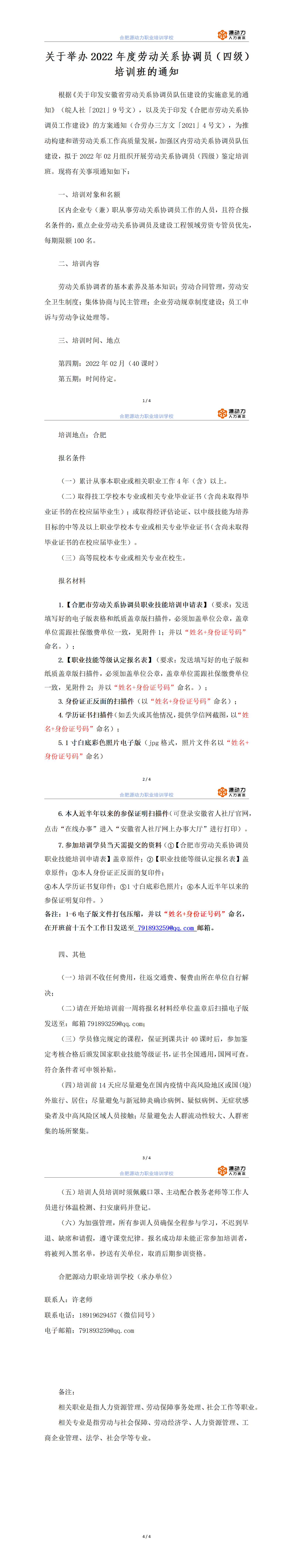 關于舉辦 2022年度勞動關系協(xié)調員(四級) 培訓班的通知