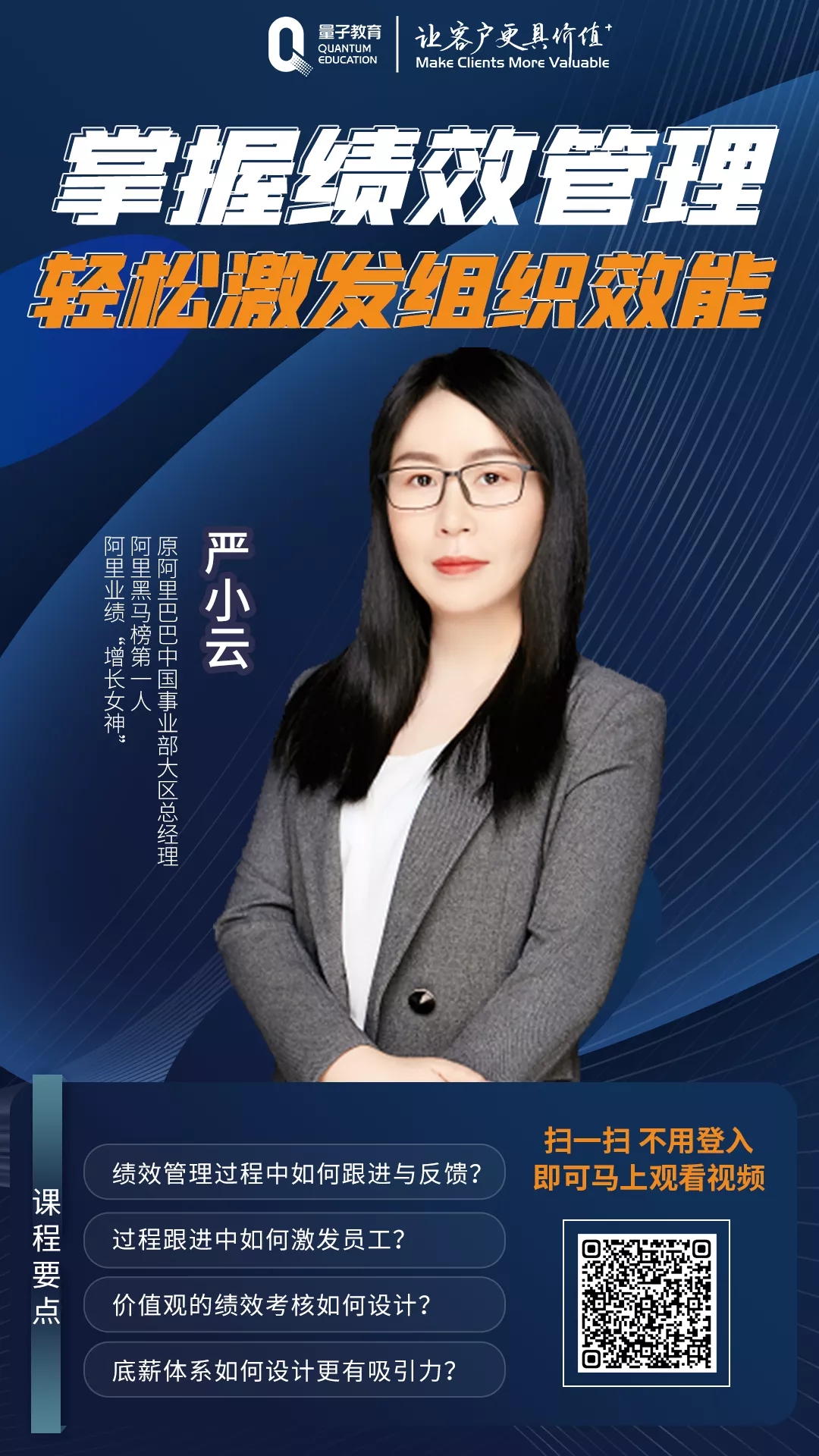原阿里巴巴中國區(qū)事業(yè)部總經(jīng)理、阿里“增長女神”嚴小云老師聯(lián)合量子教育推出了全新精品好課《掌握績效管理,輕松激發(fā)組織效能》。