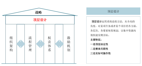 頂層設(shè)計(jì)是一個(gè)系統(tǒng)工程,涵蓋戰(zhàn)略、組織、流程和制度等多種組成部分,管理模式的變革是建立在頂層設(shè)計(jì)之上。